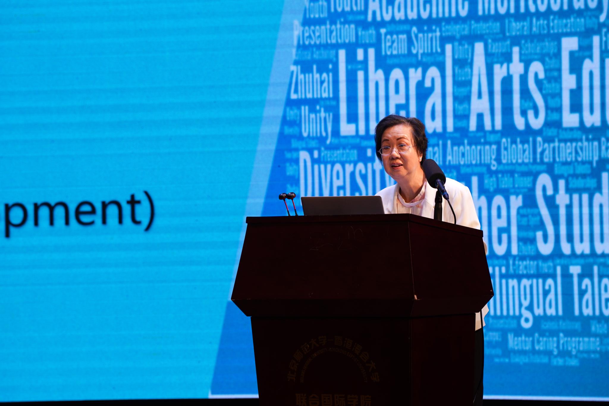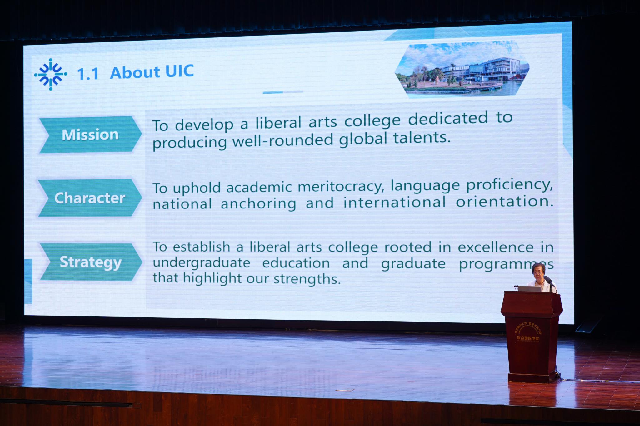 After extending a warm welcome to the new students, Prof. Stella CHO explained the concept of General Education (GE) in the context of liberal arts education at UIC. She pointed out that liberal arts education is to cultivate students’ knowledge, skills and values needed to be well-round professionals, responsible citizens, and lifelong learners, with the purpose of nurturing students with international outlook and fostering Chinese culture and national passion. She also highlighted the importance of GE in contributing to the seven Graduate Attributes: Citizenship, Knowledge, Learning, Skills, Creativity, Communication, and Teamwork, and that GE could help students to develop critical thinking and analytical reasoning skills, and to cultivate innovative ability.