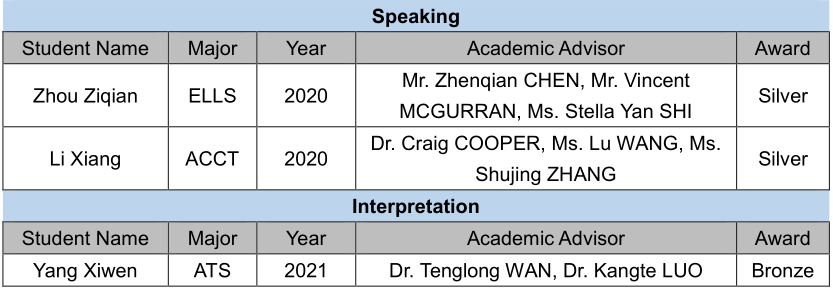 The UIC contestants were accompanied by Ms. Cathy Shujing Zhang and Ms. Gil Lu Wang from SGE English Language Centre. They worked remotely with other advisors from UIC to provide coaching and support to our students. The ceaseless effort made by students and ponderable guidance offered by their coaches were paid off by the break-through achievements in the contests. Moreover, the accomplishment is inextricably associated with UIC’s liberal arts education aimed at nurturing students with international outlook and fostering Chinese culture and national passion. With the support of UIC and its management, the UIC students are bound to break new grounds in the future.