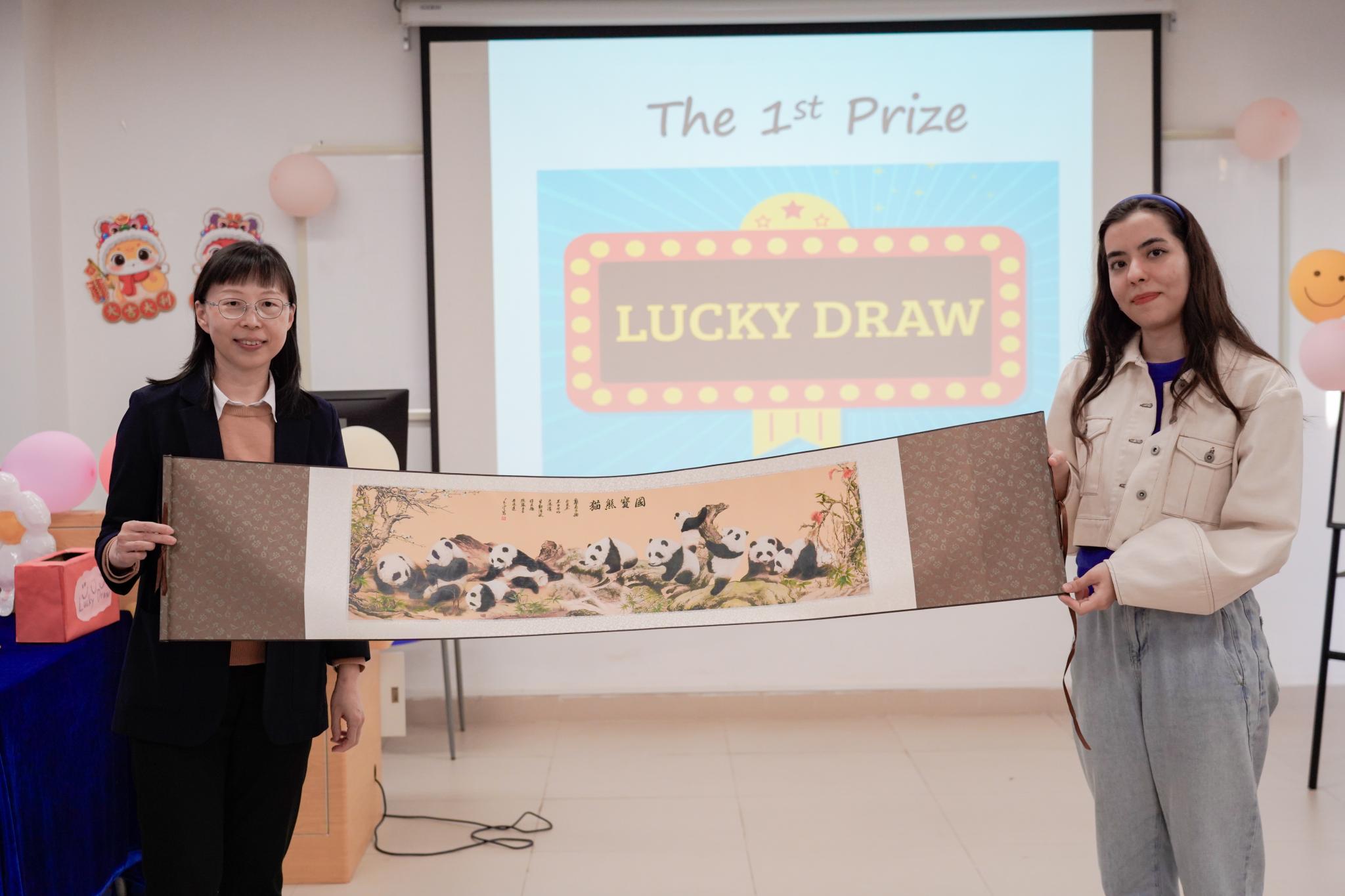 CLCC teacher and course convener Dr. Jenny Cui (left) presents the Lucky Draw 1st Place Prize to international student Nil Rana Colakoglu (right) from Turkey