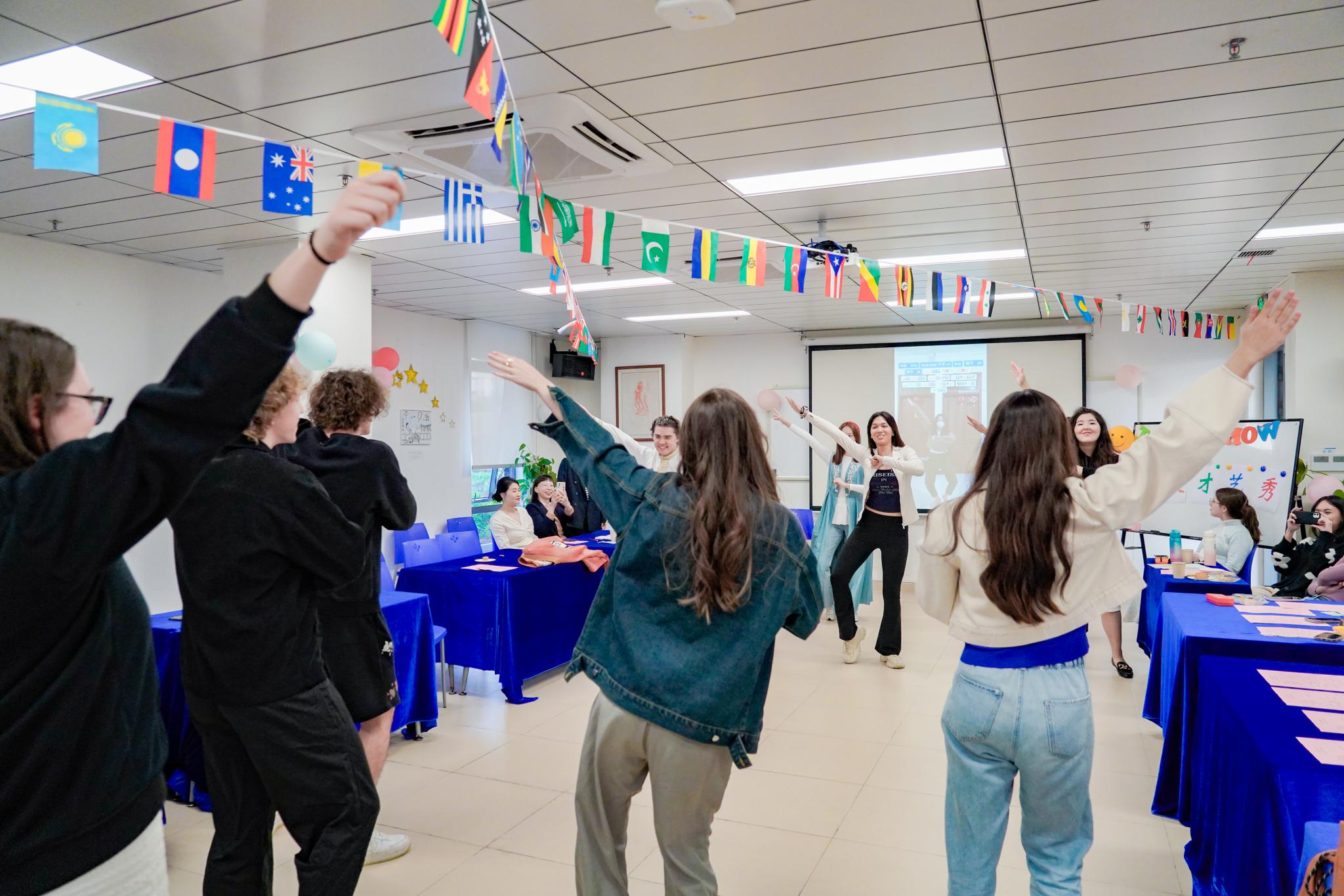 Elementary Chinese I class teaching participants the dance “Ke Mu San (科目三)”