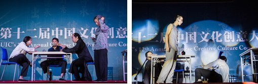 大赛共邀请了6位校内外嘉宾担当评委,他们分别是:香港中国文化院学术部总监林卫平女士、UIC教务长李建会教授、全人教育办公室主任郭海鹏博士、中国语言文化中心董铁柱博士、何潇潇博士和2014年第九届中国文化创意大赛最佳女演员蔡津淇同学。大赛的形式和赛制与往年一致,本届共有34个学社作品参与初赛选拔,一路过关斩将,最后有6个作品脱颖而出,参加本场决赛。在每一个作品表演完成后,都有一位评委对该作品进行点评,6位评委独立给每一个作品打分,评出冠亚季军和优秀奖。