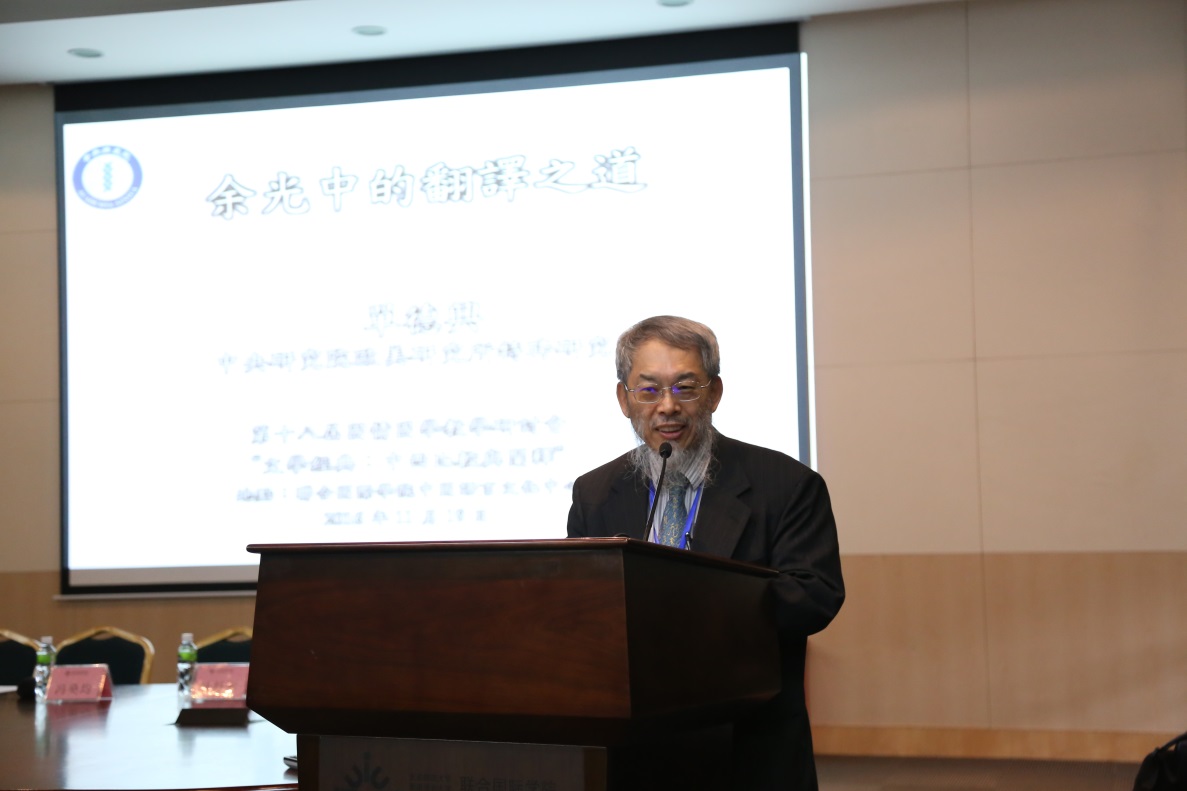 第一位进行演讲的是台湾中央研究院特聘研究员单德兴先生,其演讲题为《余光中的翻译之道》。单德兴先生是台湾著名诗人、散文家、翻译家余光中先生的弟子,本身亦是著名的翻译家,此次演讲,旨在向大家揭示余光中以往相对被忽视的翻译者身份。单先生以余光中的诗作《江湖上》与本届诺贝尔文学奖获得者、著名民谣歌手Bob Dylan的名作Blowin’ in the Wind作为引入,指出余光中自称“文学的多妻主义者”,而翻译则是其“写作生命的四度空间”之一,在其文学历程中占有重要位置,并且翻译亦深深地影响了余光中的诗歌创作。单先生以“三者合一(作者、学者、译者)”“六译并进(翻译、论翻译、评翻译、教翻译、编翻译、提倡翻译)”高度概括了作为译者的余光中的特点,并详细介绍了余光中的翻译作品及翻译理论。单先生在提到大学时期的余光中翻译英诗的事迹时,更是以一句“Just do it”鼓励在场学子,引来全场的笑声与掌声。最后单先生以“翻译乃大道”总结了演讲,通过这次演讲,“译者余光中”的鲜明形象已烙印在听众心中,使大家对余光中先生的文学成就有了更全面深入的认识。