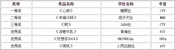 精彩的现场表演过后,现场播放了第十一届中国文化创意大赛DV类获奖作品剪辑。中国文化创意大赛分现场表演类和DV作品类。本次DV大赛共计收到参赛作品90余部,经过前期的初赛、复赛,共有6部作品进入决赛,竞争十分激烈。最终,来自大二电影电视专业(CTV)的“辑熙社”作品《心钟》摘得桂冠,该学社也成功卫冕创意大赛DV类冠军。DV获奖作品如下:
