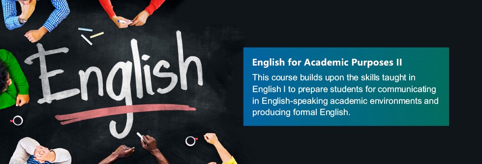 This course aims to prepare students for communicating in English-speaking academic environments by building upon the reading, writing, listening and speaking skills taught in English I, as well as further developing their ability to produce formal English. Through a detailed examination of the requirements of producing English for academic purposes, students will learn to identify and evaluate suitable academic sources and to understand and avoid plagiarism. Students will be required to present information in both spoken and written formats appropriate in an academic context.