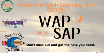 Welcome to the Student English Learning Hub (SELH) The Student English Learning Hub (SELH) is your central hub for comprehensive English language support. We are here to complement your classroom learning and help you achieve confidence and proficiency, whether for academic success, professional goals, or personal enjoyment. Our services range from curriculum support to an exciting schedule of extracurricular ...