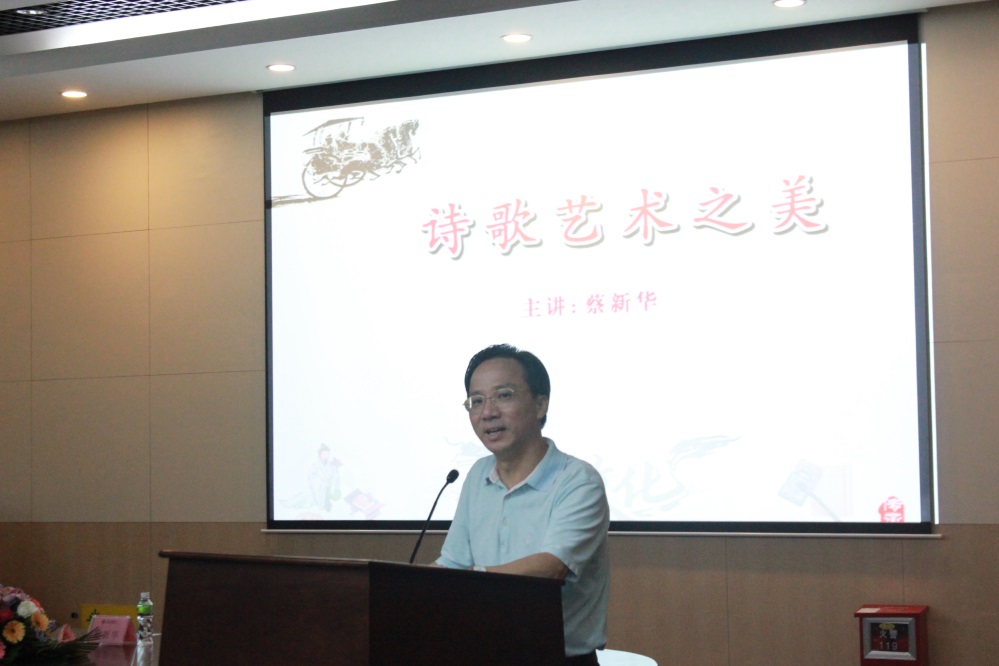 下午两点半,蔡新华先生于冯燊均演讲厅(B101)开始他的主题演讲:“诗歌艺术之美”。讲座由李茀民博士主持,教务长、科研处处长张根发教授出席并致送纪念品。