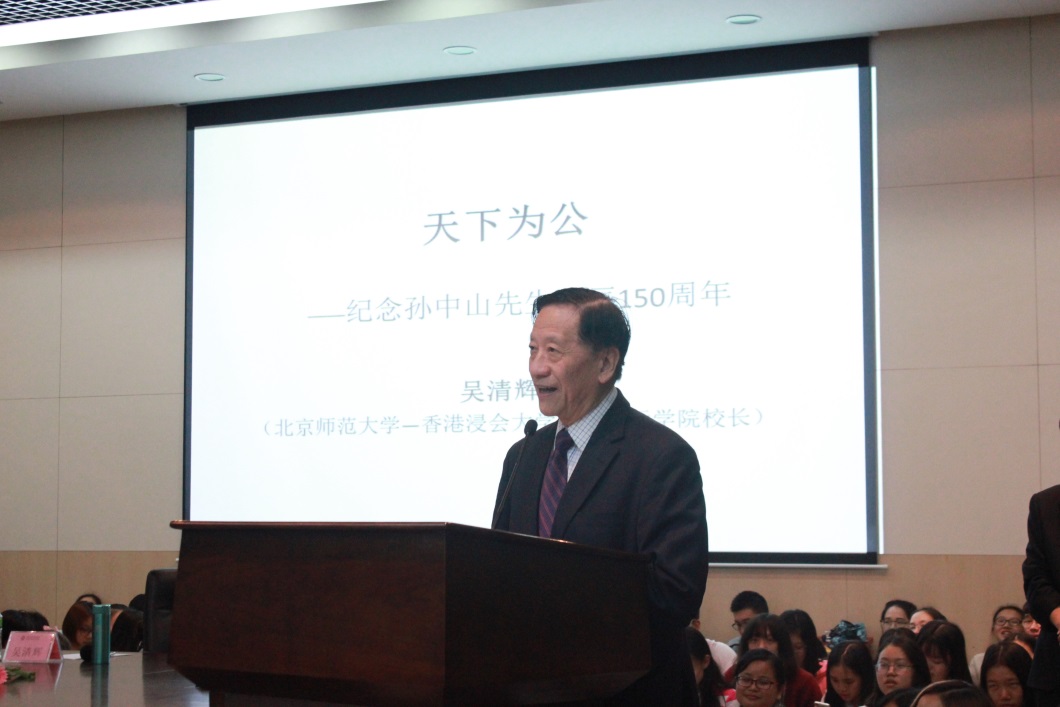 2016年11月12日是孙中山先生诞辰150周年纪念日。为缅怀先辈,学习他的革命思想和奋斗精神,2016年10月19日,在冯燊均演讲厅(B101),吴清辉校长作《天下为公——纪念孙中山先生诞辰150周年》的主题演讲。这也是中国语言文化中心主办的本学期国情国学教育系列讲座的第一讲,讲座由中国语言文化中心主任伍鸿宇博士主持,出席讲座的嘉宾有:张聪副校长、文化与创意学部代理院长邱志勇教授、工商管理学部李新宝教授、管弦乐团音乐总监刘美群女士以及校内各学部老师等。现场座无虚席,很多同学席地而坐,现场气氛热烈。