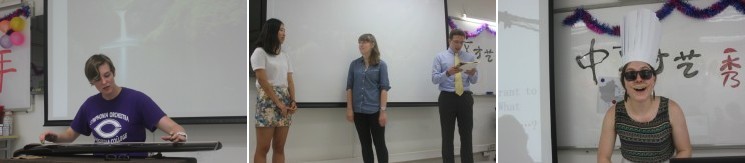 外教和学生们不拘于形式,为本次才艺秀带来了丰富多彩的节目。中级汉语(I)班美国交换生Jenna带来了古琴演奏《流水》,让大家在静静聆听中体会“高山流水遇知音”的意境;中级汉语(II)班的同学们,美国交换生李丝(Elise)、韩国的姜韶英以及Kennan带来的相声表演《宴会上的规矩》分享了中国礼仪;汉语快车班级7名助教热闹上场给大家绘声绘色表演了小品《Finger Food》,那夸张的厨师帽,逼真的土豆雕刻的手指,让全场笑声不断。还有动画片《海绵宝宝》配音,韩国交换生Jane的诗朗诵《静夜思》,大一国际政治专业的美国学生博恩(Arizton)的吉他弹唱《我真的受伤了》赢得了大家热烈的掌声,在整场表演的最后,三位来自初级汉语(II)的交换生带领大家合唱《节日歌》。