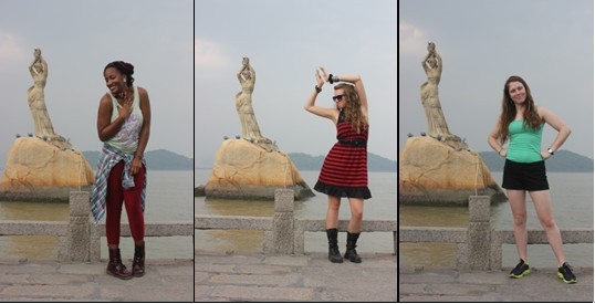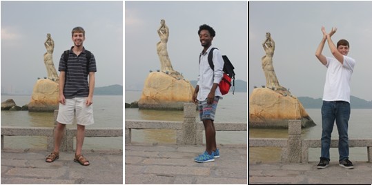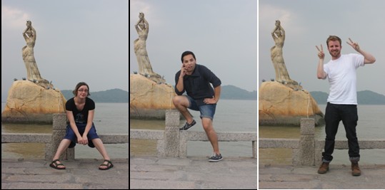 中国语言文化的课程也由此展开。在几节汉语课之后的一个初秋下午,中国语言文化中心组织了第一次文化活动,活动的主题是“你好,珠海”。美国、法国、挪威等各国的Interns和国际生和带队老师一行三十人,对珠海的了解,就从珠海渔女开始。珠海渔女雕像是珠海城市的象征。建成于1982年,是中国著名雕塑家潘鹤的杰作。渔女形象源自于珠海一个美丽的爱情传说。其塑像姿态优雅,手擎明珠,向人类奉献珍宝,向世界传递着光明。尽管烈日当空,大家还是饶有兴趣地留下了和渔女的“合影”。 有的学着中式的常见姿态,有的表现着美式的个性张扬,他们带来的欢声笑语也感染着旁边的游客。在不同文化的碰撞中,大家也许会对彼此的文化多几分的直观认识吧?在下面的照片中,你看到被调侃的“剪刀手爱德华”了吗?