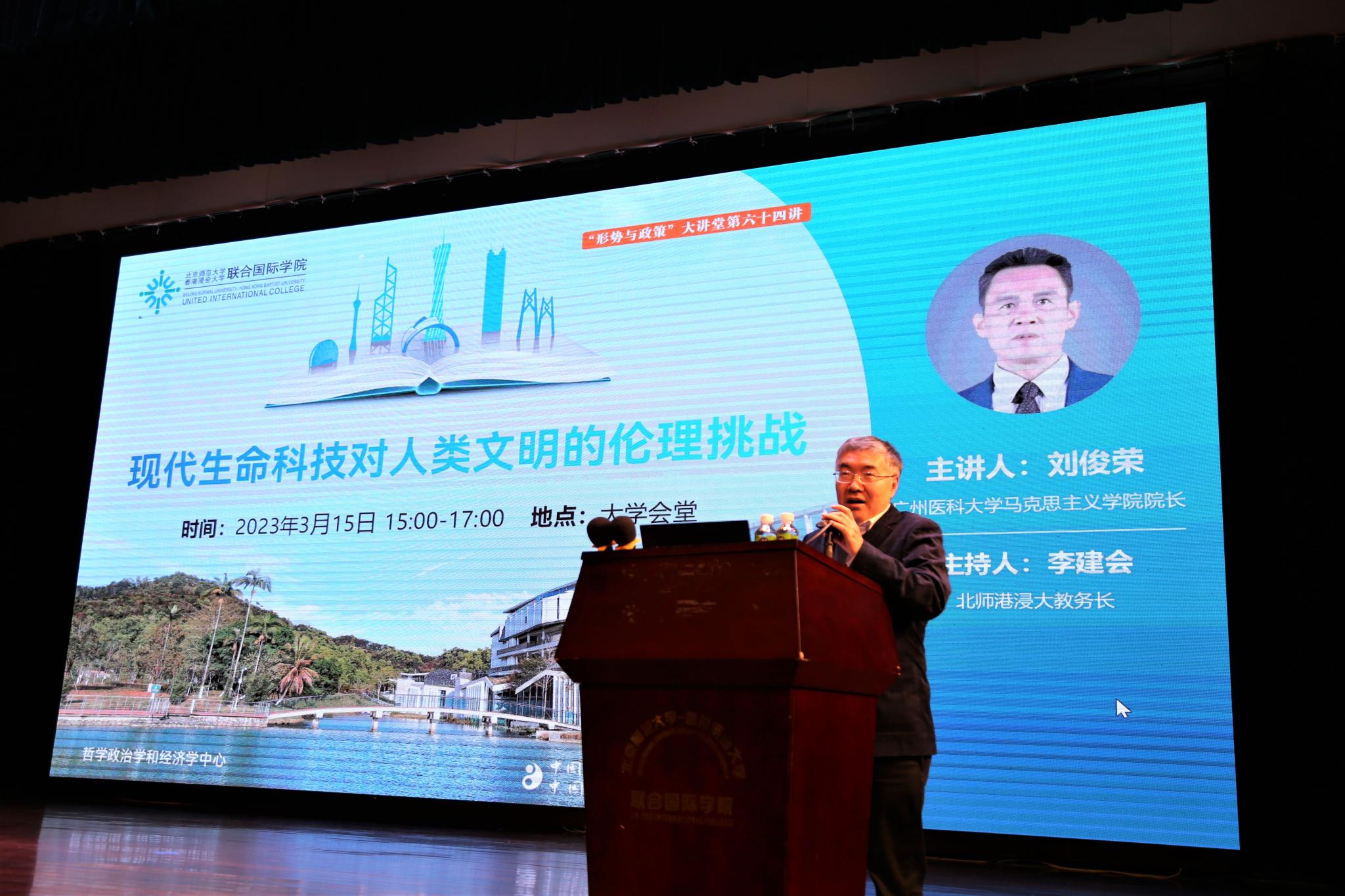 2023年3月15日下午,广州医科大学马克思主义学院院长刘俊荣教授来到UIC,在大学会堂为同学们带来形势与政策大讲堂第六十四讲——“现代生命科技对人类文明的伦理挑战”,讲座由北师港浸大教务长李建会教授主持,吸引近百位同学到场聆听。