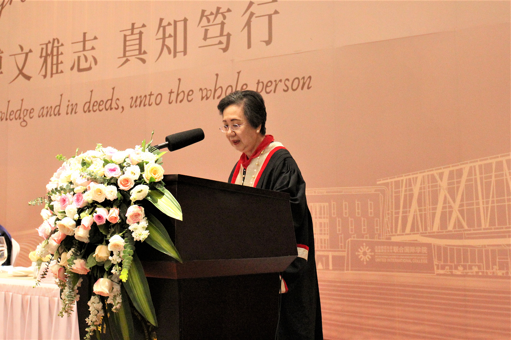 北师港浸大协理副校长(学生发展)、通识教育学院署理院长左龙佩兰教授作为本次高桌晚宴的主席以中英双语致欢迎辞。她表示:“UIC的高桌晚宴是中西方礼仪文化的融合。在这样一个强调仪式感的活动中,不仅可以潜移默化地学习社交礼仪和餐桌礼仪,更能够通过聆听专家学者的演讲,以及师生之间的广泛交流,开阔视野和胸襟。这也是我校通识教育立德树人的重要途径。”她在致辞中强调:“通识教育学院致力于培养学生的学识、技能、价值观和国际视野,引导学生成长为全面发展的专业人才、负责任的公民和终身学习者。”