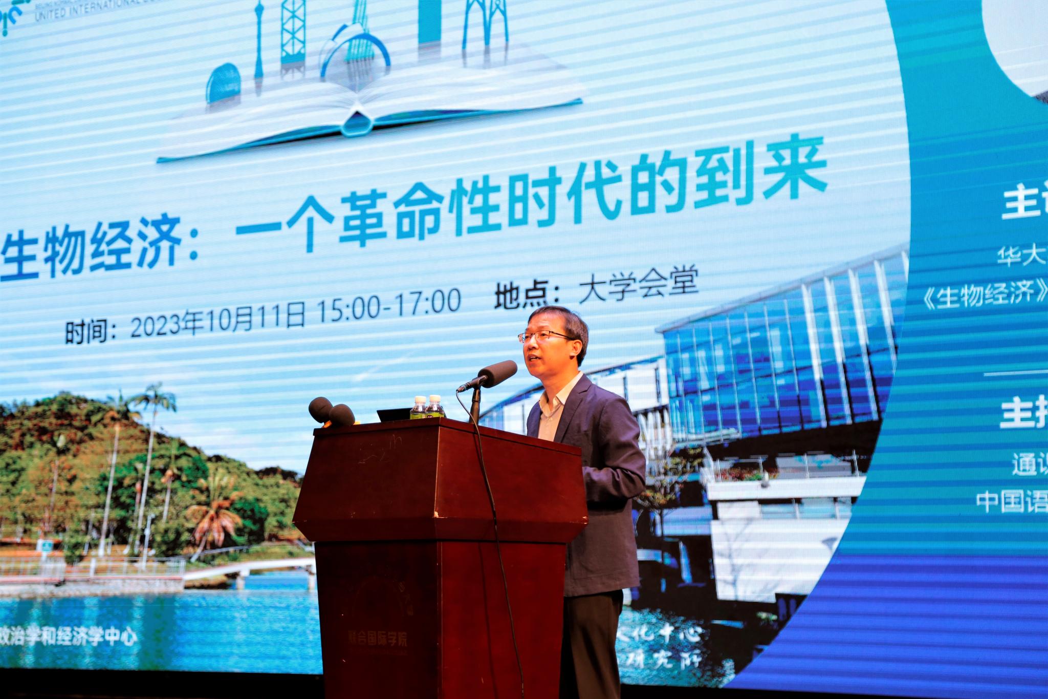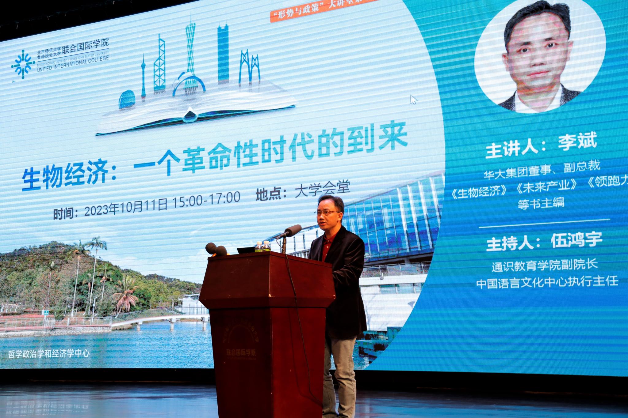 2023年10月11日下午,华大集团董事、副总裁李斌先生应邀在大学会堂为UIC师生们带来了一场精彩的演讲,演讲题目为“生物经济:一个革命性时代的到来”。本次讲座是“形势与政策”大讲堂第七十八讲,由UIC通识教育学院副院长伍鸿宇教授主持。