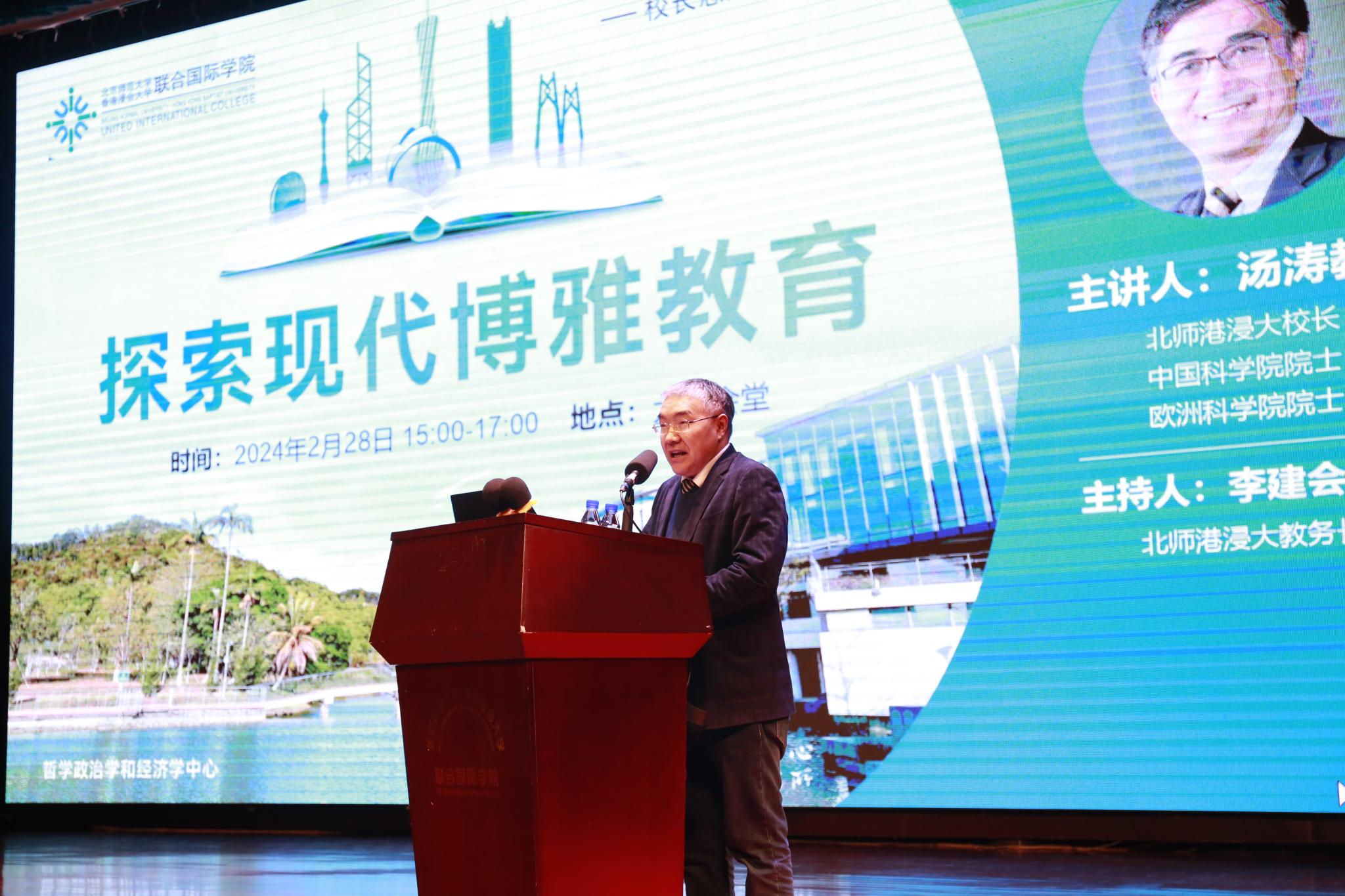 2024年2月28日下午,“校长思政第一课”在大学会堂成功举行。中国科学院院士、欧洲科学院院士、北师港浸大(UIC)校长汤涛教授为师生们带来了题为“探索现代博雅教育”的精彩演讲,此次讲座亦是“形势与政策”系列讲座之一。本次讲座由北师港浸大(UIC)教务长李建会教授主持。