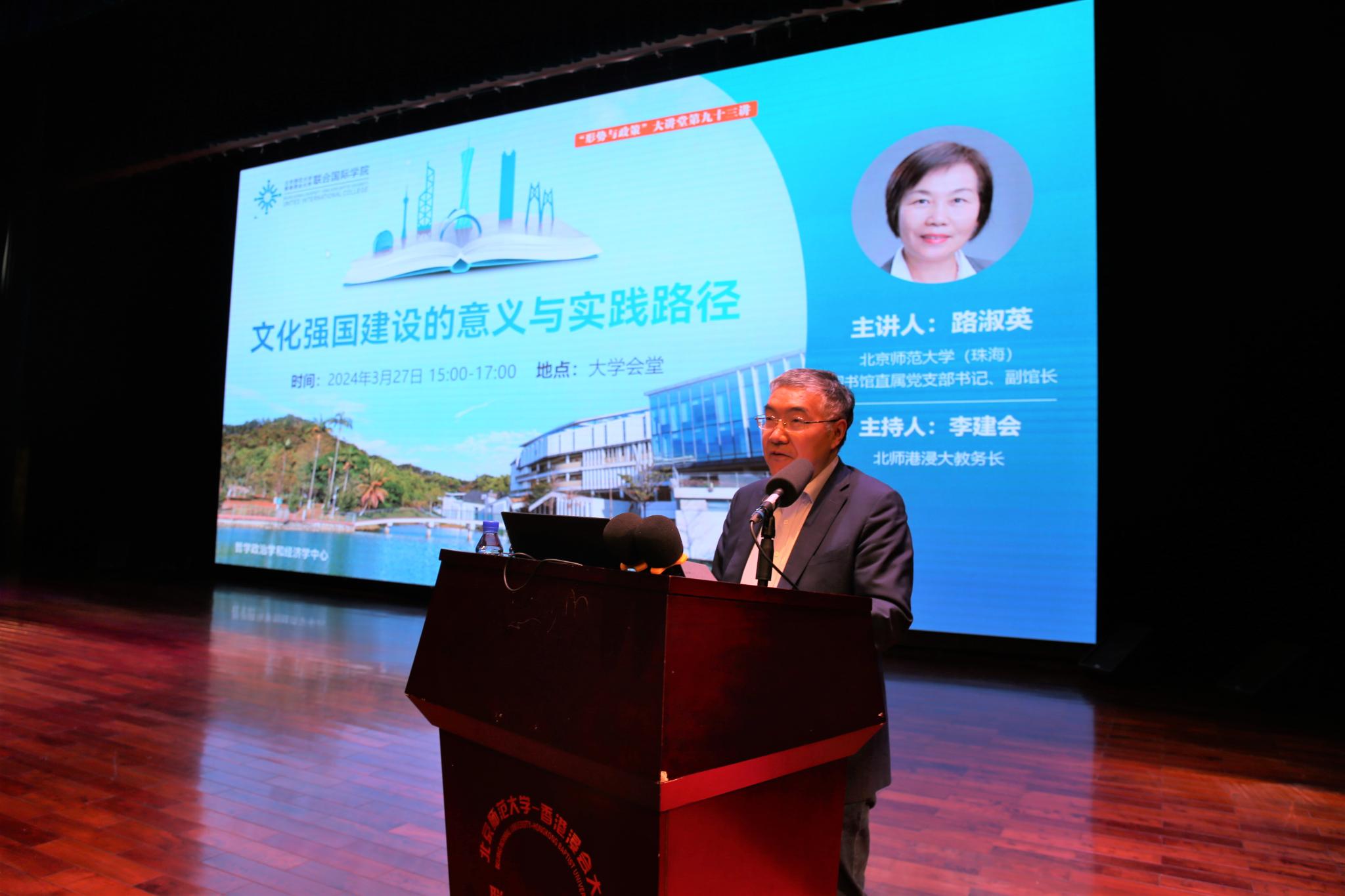 2024年3月27日下午,北京师范大学(珠海)图书馆直属党支部书记、副馆长路淑英教授为UIC同学们带来了以《文化强国建设的意义与实践路径》为题的精彩讲座。本场讲座由北师港浸大教务长李建会教授主持。