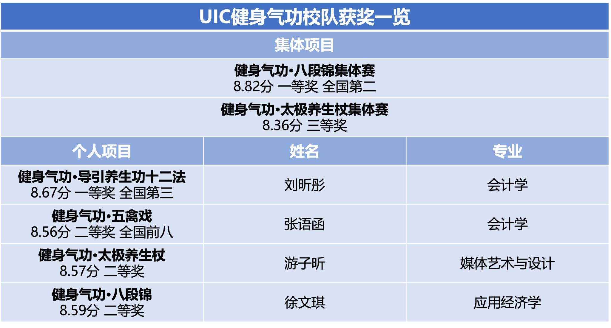 健身气功课程自2014年引入UIC后一直深受学生喜爱。学生们在课程中能够一方面感受中国五千年传统健身养生文化,另一方面通过学习健身气功项目中八段锦等优秀健身方法,提高对自己身心健康的重视及促进良好养生习惯的形成。此次比赛,体现了我校学生传承中国健身养生文化精神、延续新时代健身气功体育文化内涵、主动担当建设“体育强国”的责任使命,让更多人看到健身气功绵延不绝的历史文化底蕴,让更多的高校学生共同参与到八段锦等健身气功功法习练中来,让UIC“全人教育”的理念与实践深入人心。