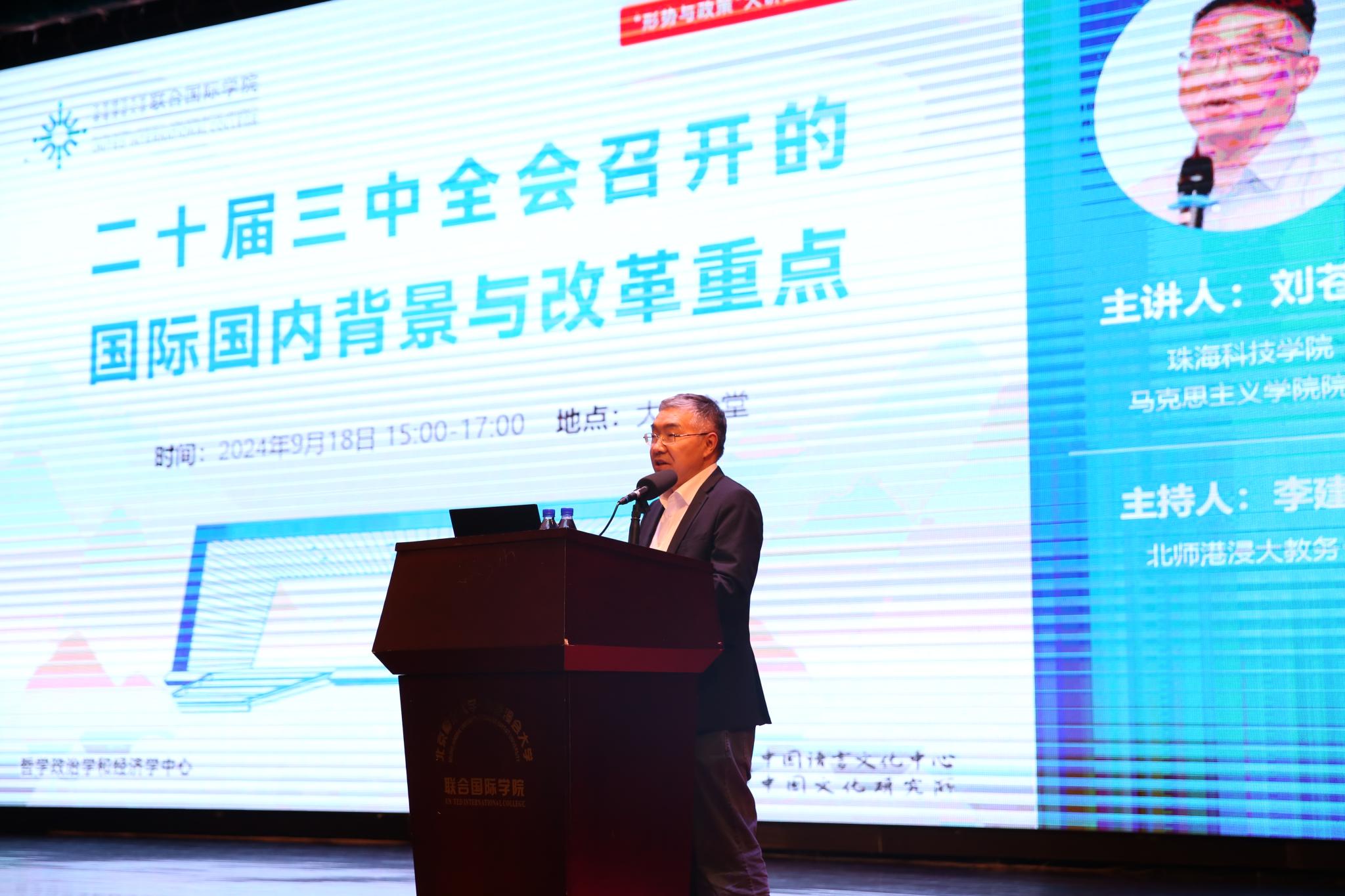 2024年9月18日下午,“形势与政策”系列讲座在UIC大学会堂举行,吸引了大量师生参加,现场座无虚席。珠海科技学院马克思主义学院院长刘苍劲教授以“二十届三中全会召开的国际国内背景与改革重点”为主题发表了精彩的演讲。讲座由北师港浸大教务长李建会教授主持,现场氛围热烈,学术气息浓厚。