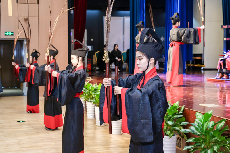 典礼在雅乐团演奏的《木瓜》中拉开序幕,在悠扬的乐声和庄重的舞姿中,我们感受到了传统文化的韵味。随后,三轮击鼓声标志着敬师礼的正式开始。师长们为学子们整理衣冠,寓意“先正衣冠,后明事理”,学子们则以茶代礼,向师长们表达最诚挚的敬意。敬茶仪式中的三敬三饮,不仅是对古代礼仪的传承,更象征着学海无涯、学子敬意和师道尊严。