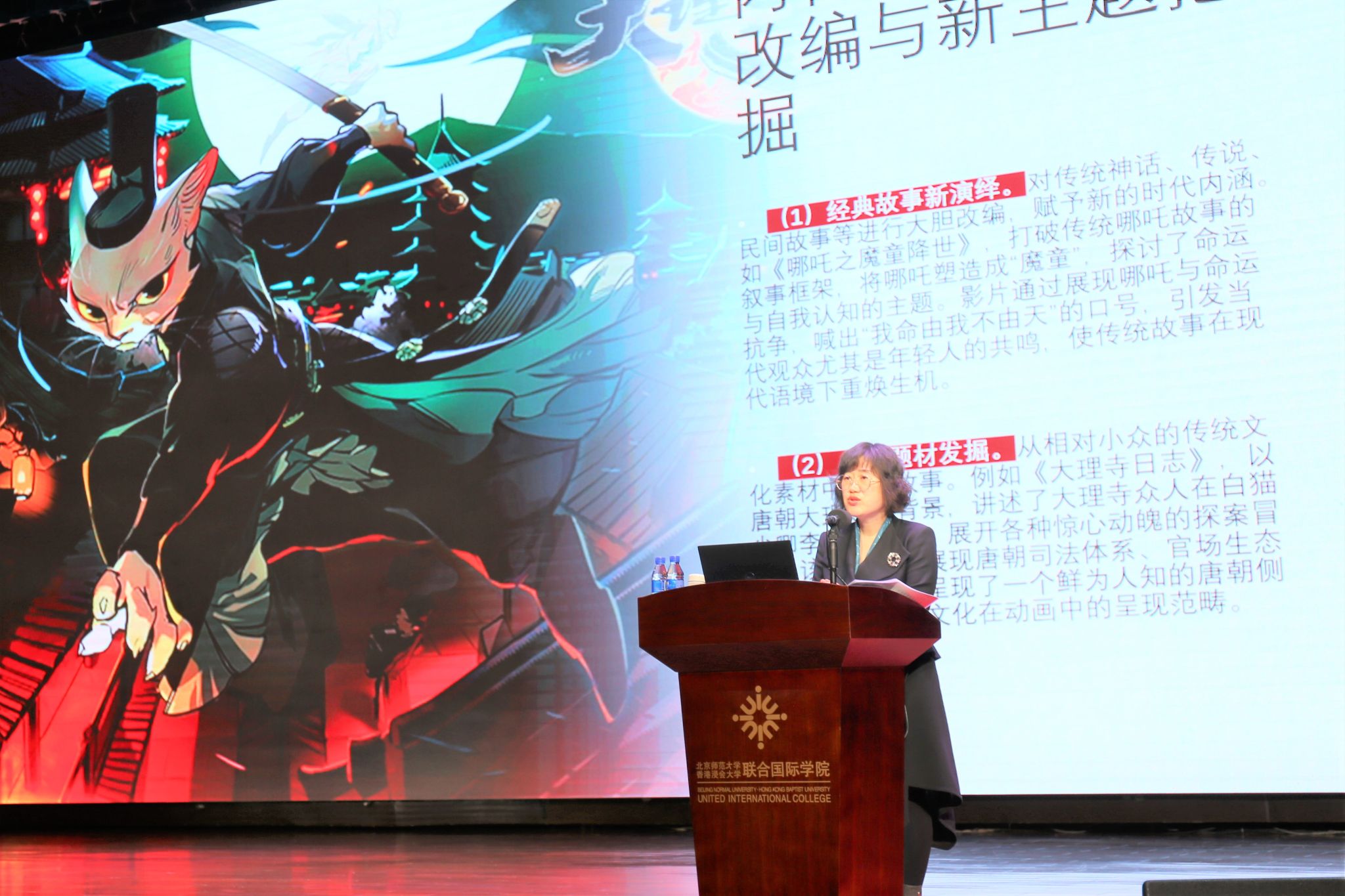 再次,陈教授分析了当下传统影视、网络视听、动画游戏、新媒体作品等多种视听媒介中所具有的创新,以《哪吒》《姜子牙》《黑神话·悟空》等大家喜闻乐见的作品为例,剖析了它们在内容和形式上的创新,具体体现在融合多种艺术风格、反传统角色设定等多方面。