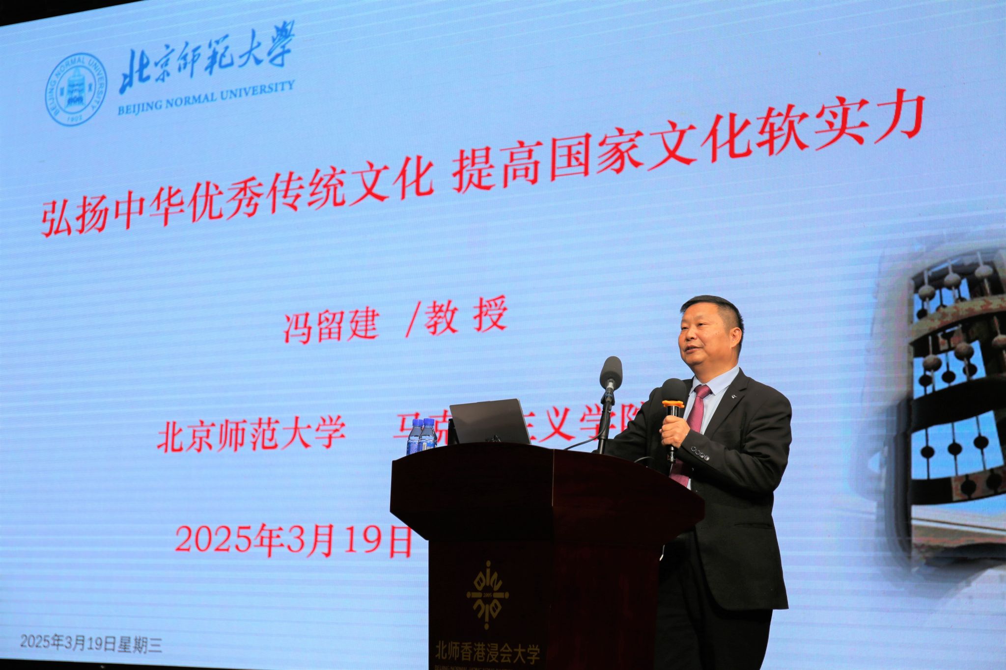 2025年3月19日下午三时,北师港浸大“形势与政策”大讲堂第123讲在我校大学会堂如期举行,讲座由北师港浸大教务长李建会教授主持,主讲嘉宾是北京师范大学京师特聘教授冯留建博士,他演讲的题目为“弘扬中华优秀传统文化 提高国家文化软实力”。我校师生齐聚一堂,聆听了冯教授的精彩演讲和深刻见解。