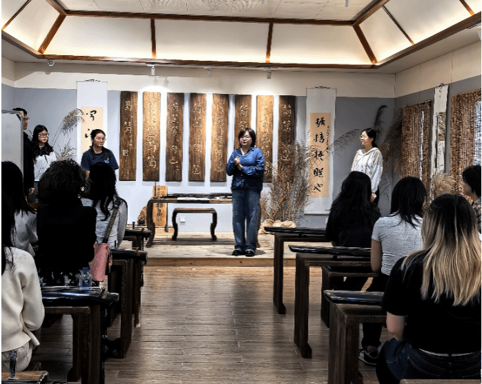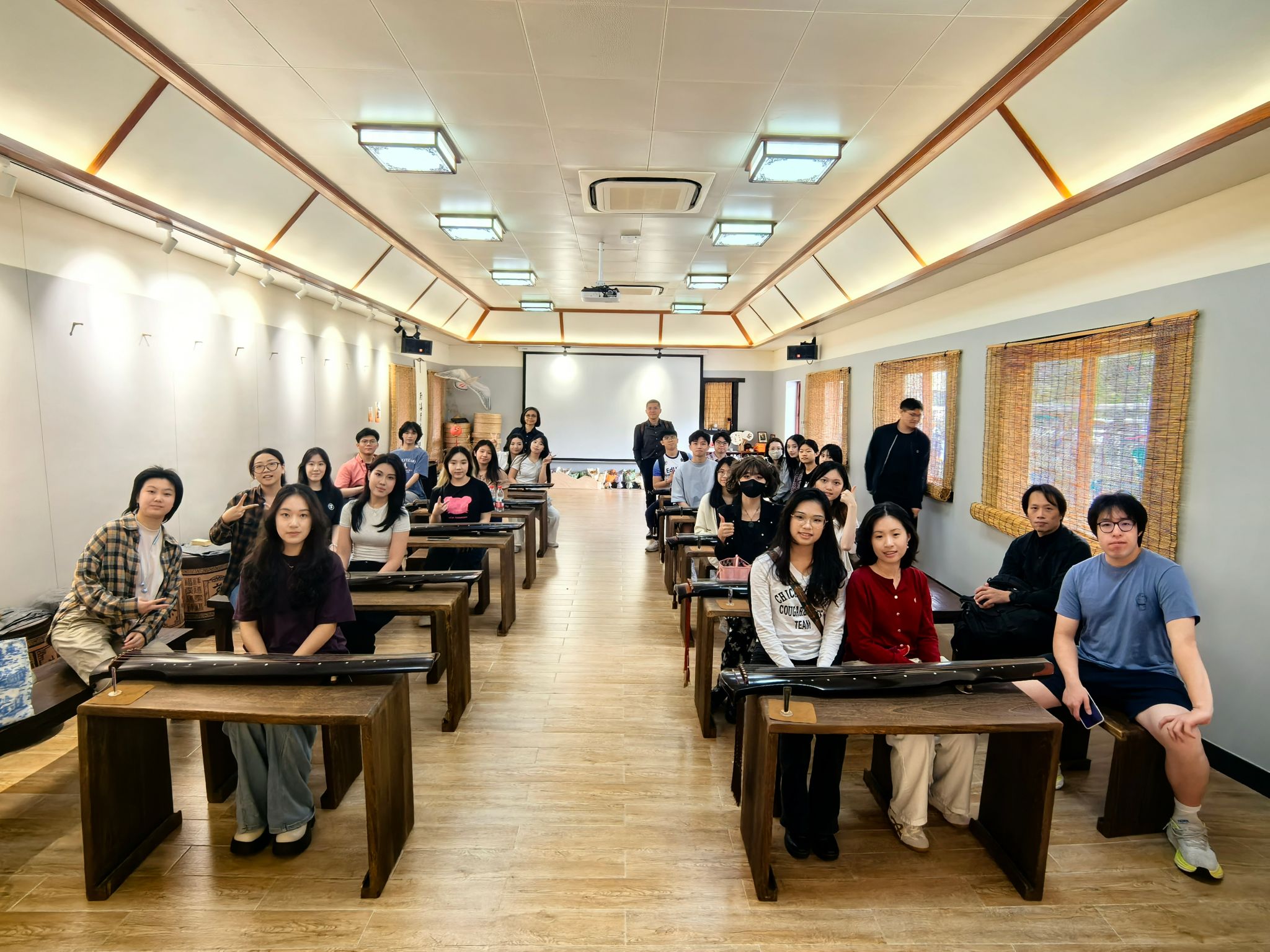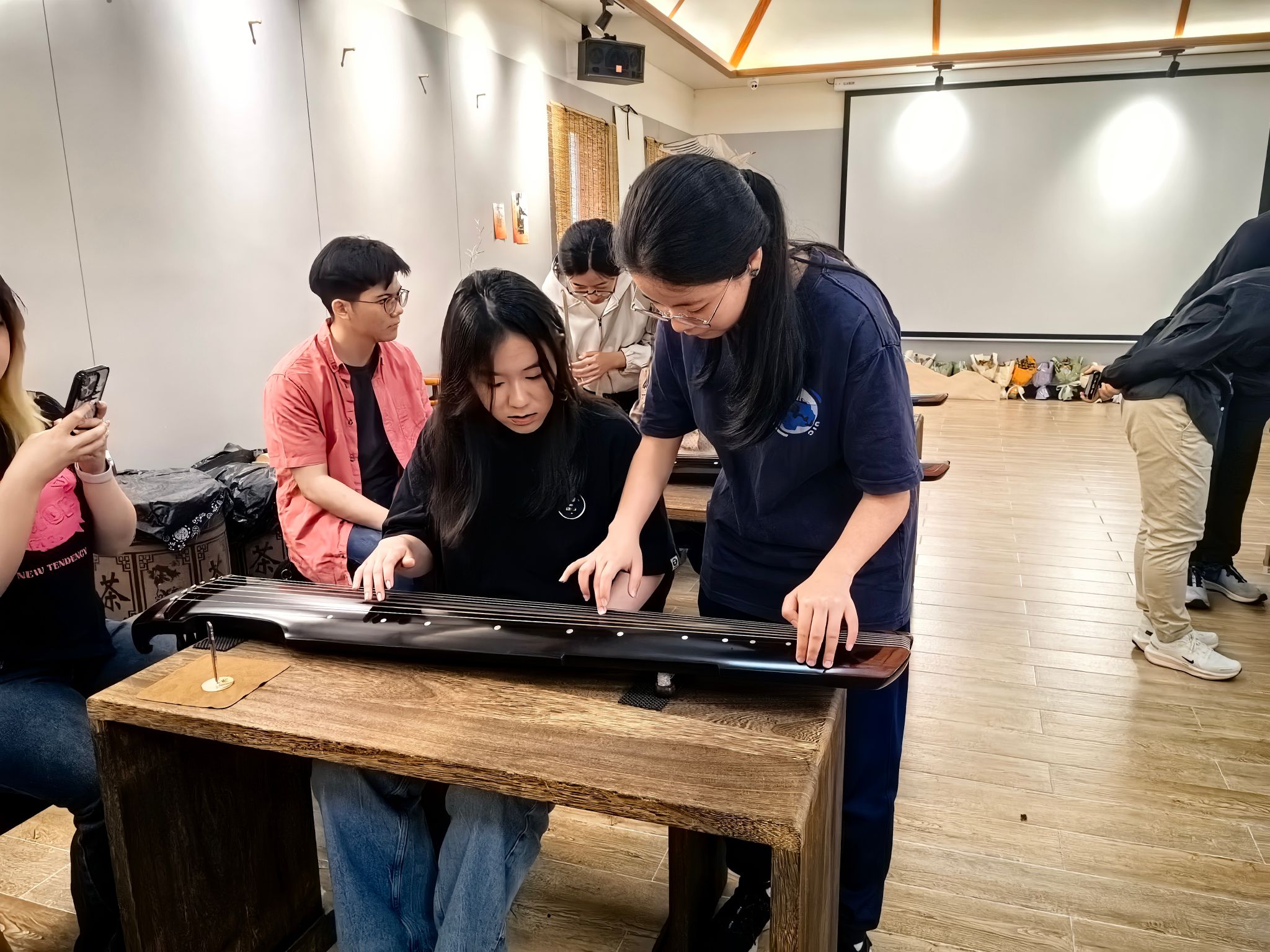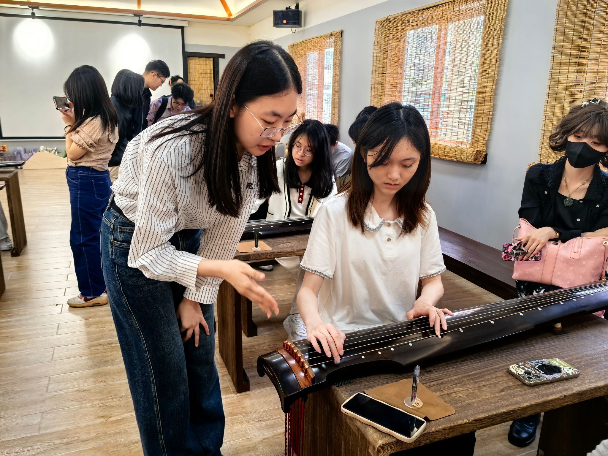 在古琴馆,齐唱任老师向师生一行介绍了古琴馆、古琴课程的情况,并请古琴社的同学进行了现场演奏。最后来访师生还亲自体验了古琴弹奏。