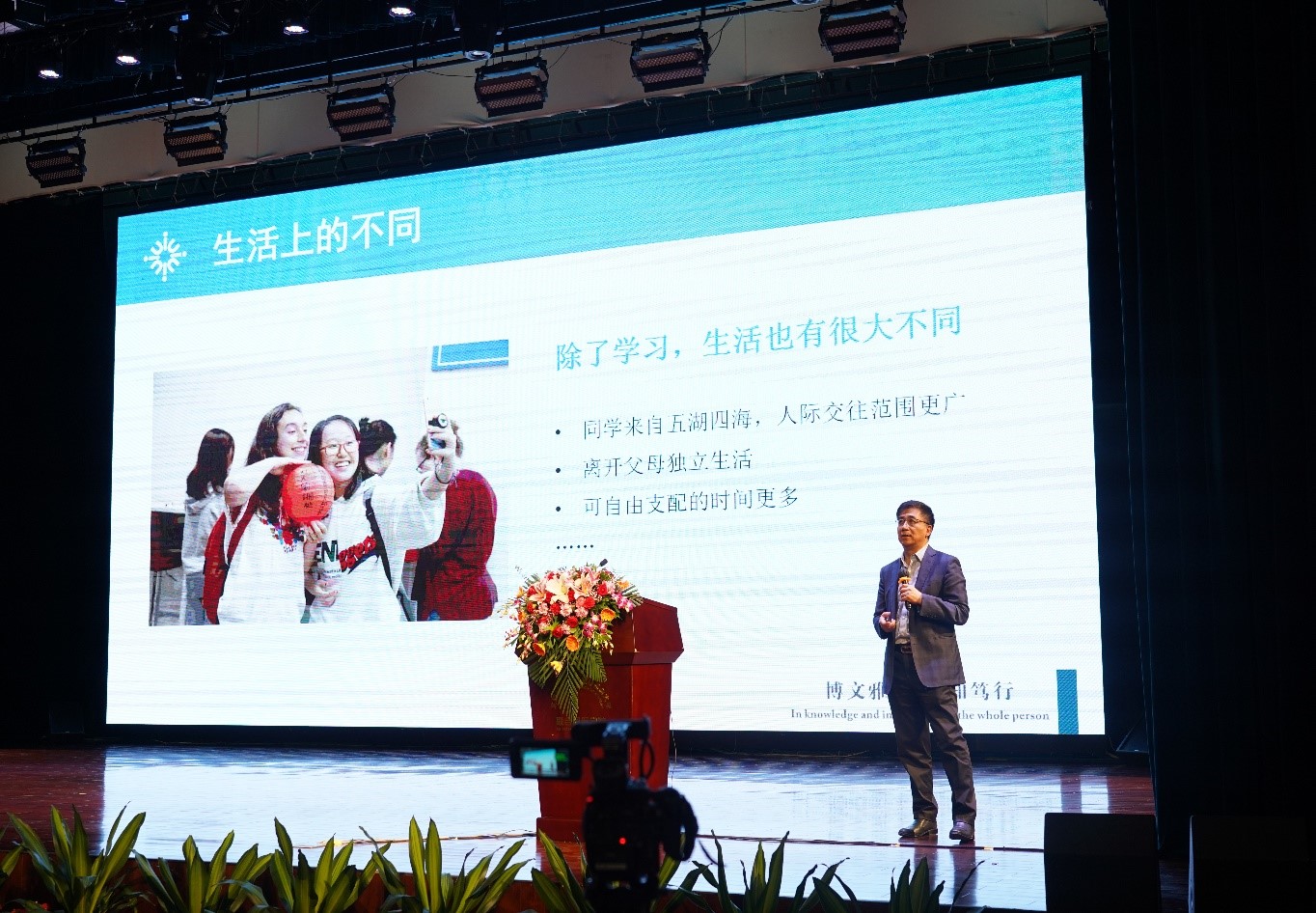汤校长首先介绍了高中与大学阶段在学习上的不同。他强调,高中学习的目标较为单一,而大学教育则是多维的。大学注重的是传承知识和创新知识,要培养的是学生的社会责任感、动手能力、实践能力和创新能力。他以微积分的学习为例,我们掌握三百年前的微积分叫做传承,但我们运用微积分创造新的知识体系就是创新和发展,这种能力的培养将是大学最重要的任务。为了实现这一点,汤校长建议同学们要尽快树立新的学习目标,产生自觉的执行力,学会主动学习。汤校长还指出,中学和大学在学习内容上也不尽相同。中学课程少,主要讲授一般性的基础知识,要求不能偏科,全面学习。而大学的学习内容广、课程多、难度大,这样就要求同学们学会有选择性地学习。但这种选择也要保持文理科均衡发展,成为一个有跨学科发展能力的新时代的建设者。最后,汤校长还介绍了中学和大学在学习方式上的不同。他指出,大学的课堂包含了小组讨论、教学实验、实习、社会调查、毕业设计等众多教学环节,为的是激发同学们自主学习的热情,培养同学们提前学习的主动性、团队合作能力、独立思考能力、批判性思维和实践应用能力。另外,汤校长还希望同学们在UIC多元的环境中,以更加开放和包容的心态,交到受益一生的朋友,提高克制能力,杜绝沉迷于虚拟游戏。在这一部分的介绍中,汤校长运用许多鲜活的例子,让同学们对大学生活有了更多具象的理解,他的谆谆教导也让同学们受益匪浅。