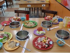 台湾每个地方几乎都有特色菜品。我们在台北吃过美味的阿美担仔面,店面虽小,但味道堪称一绝,连店内的装饰也别具一格。在新竹品尝过叶千翡老师和蒲彦光老师带来的"风城"柿子饼,是一种里面包着柿子肉的Mochi,味道很独特。在嘉义吃过火鸡饭,搭配的菜品同样很有味道,吃得大家食量大开。在日月潭畔的酒楼上吃过非同寻常的"总统鱼"。在垦丁亲身体验过恒春烧烤的风味。在高雄吃过地道的涮涮锅,也体验过冰沙店的魅力。我们在名为大碗公的冰沙店一饱口福,不仅冰沙冰凉爽口,盛放冰沙的碗之大也令人赞叹。20多人把直径约80厘米大的一碗冰沙吃的净光,同学们食冰的热情高涨。