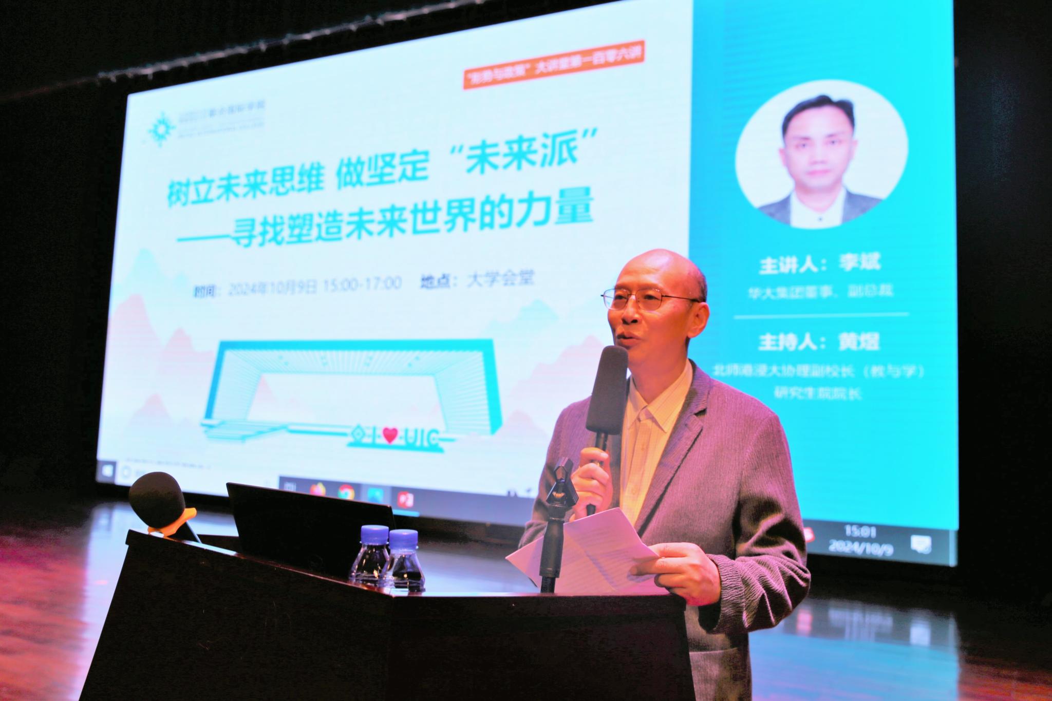 2024年10月9日星期三下午,形势与政策大讲堂第一百零六讲在UIC大学会堂成功举行。华大集团董事、副总裁李斌为在场师生带来了主题为“树立未来思维,做坚定‘未来派’——寻找塑造未来世界的力量”的精彩演讲。本次讲座由北师港浸大协理副校长(教与学)、研究生院院长黄煜教授主持。